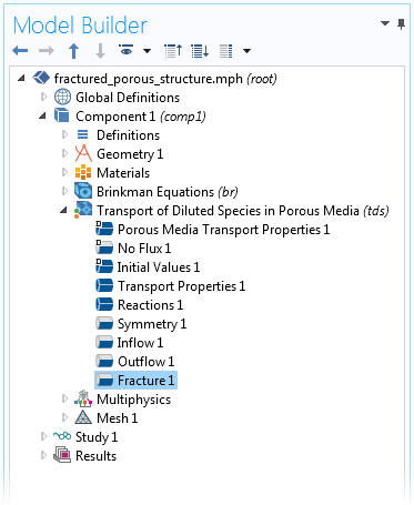 In cases where transport occurs in a fractured, porous 3D structure, the new Fracture boundary condition lets you model transport in the thin fractures without having to mesh them as 3D entities. The Fracture boundary condition is included in the Transport of Diluted Species in Porous Media interface (see image) and has the same settings as in the Transport of Diluted Species in Fractures interface (described above). Fluid flow and chemical species transport are seamlessly coupled between a 3D porous media structure and fluid flow and chemical species transport in a fracture.
