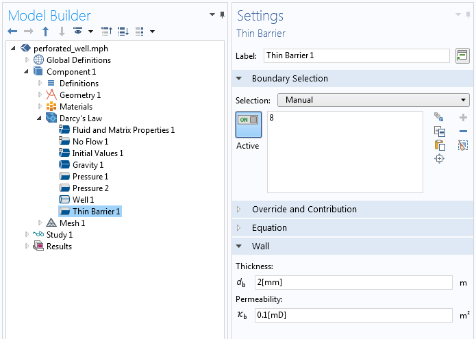 In the Darcy's Law and Richards Equations interfaces, you can now define permeable walls on interior boundaries with the Thin Barrier boundary condition. These internal boundaries are typically used to represent thin, low-permeability structures. With the Thin Barrier boundary condition, you avoid meshing thin structures like geotextiles or perforated plates, thus reducing computational time and resources.