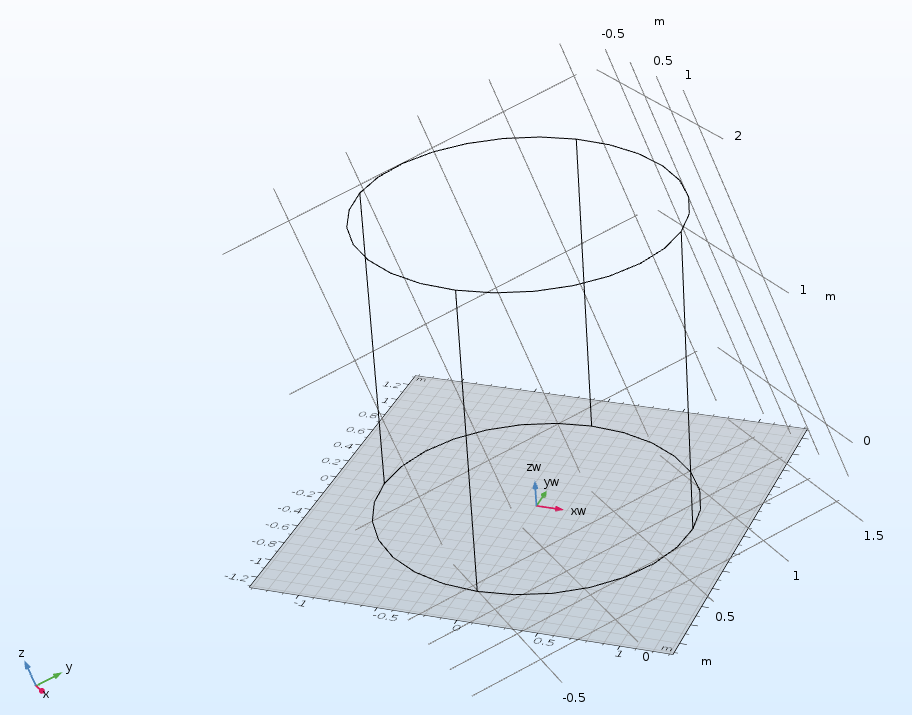 Before the new version of COMSOL Multiphysics®, when building your geometries, you had to define the positions and orientations of primitive objects using the standard global coordinate system. Now, you can work in a local coordinate system when editing the settings of a primitive or transform feature that is used to build your geometry. You can do this by first creating a work plane, which defines the local coordinate system in which you would like to work. New primitives that are then added to your geometry use this new local coordinate system, so you can more easily specify the primitive's position and orientation. To use this new functionality, you choose the work plane in the Coordinate System section in the Settings window. Then, the work plane and its local coordinate system axes — xw, yw, and zw — appear in the Graphics window.