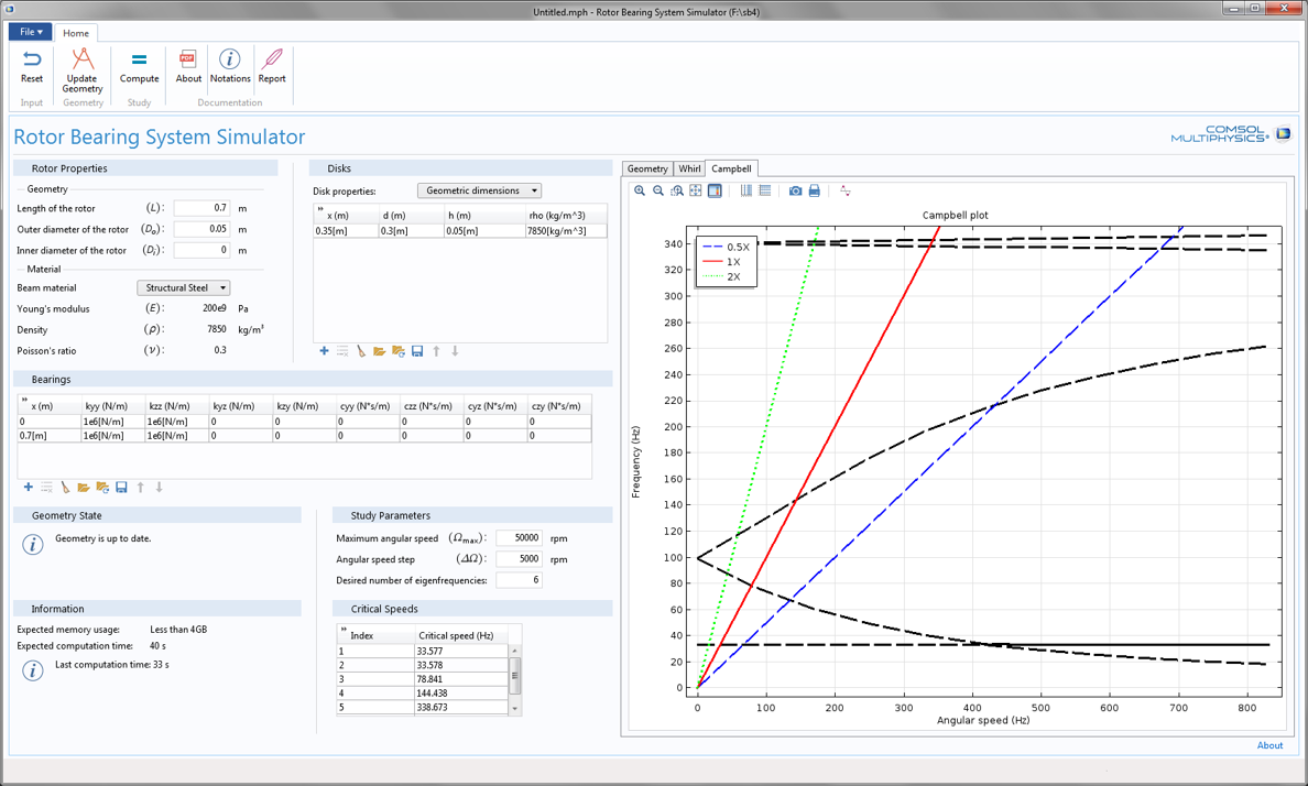 A COMSOL app for simulating rotor bearing systems. The user interface of the Rotor Bearing System Simulator app. Inputs include geometrical dimensions and material and operating conditions. Outputs include Campbell and Whirl plots and a table of critical speeds. The user interface of the Rotor Bearing System Simulator app. Inputs include geometrical dimensions and material and operating conditions. Outputs include Campbell and Whirl plots and a table of critical speeds.