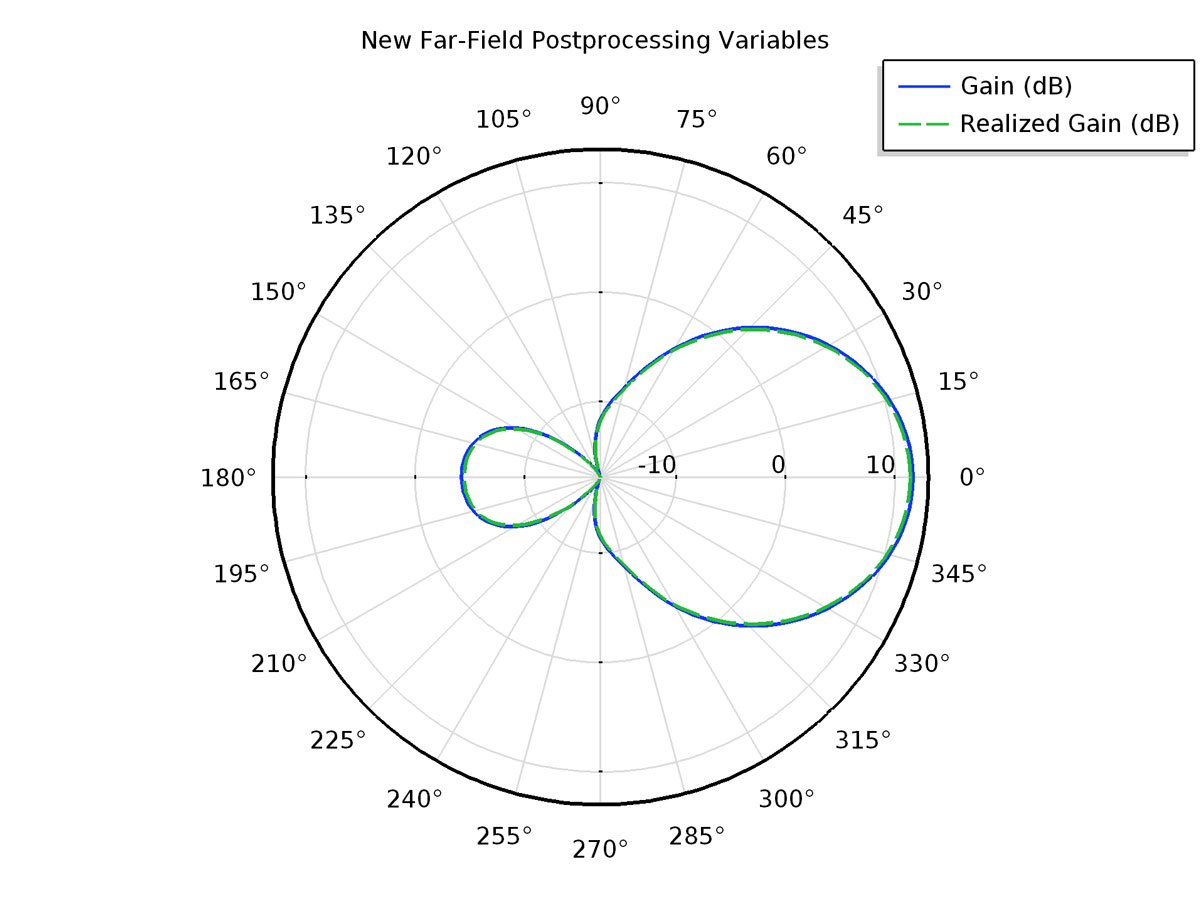 Additional postprocessing variables have been added to the physics interfaces that calculate far-field radiation patterns. The previous gain variable is clarified with gain and realized gain by the input impedance mismatching factor. These postprocessing variables can be used in far-field plots to visualize the characteristics of an antenna.