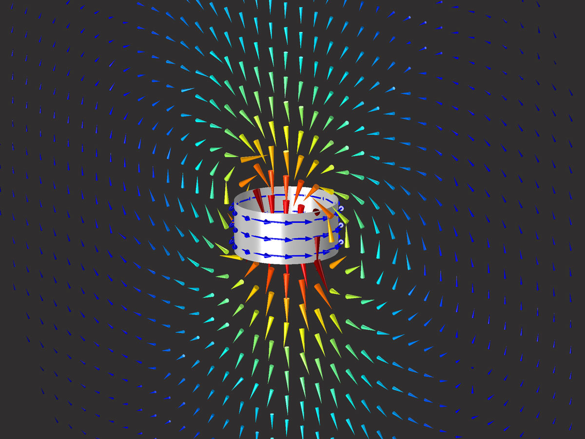 Surface magnetic current density (blue arrows) on a cylindrical coil through use of the Surface Magnetic Current Density boundary condition in the Electromagnetic Waves, Frequency Domain interface. The electric field pattern (cone) resembles that of a short dipole antenna.