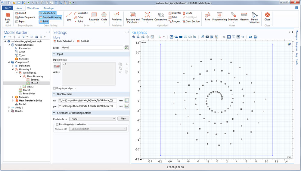 Two analytic functions are used to create an archimedean spiral of squares with the Move feature.