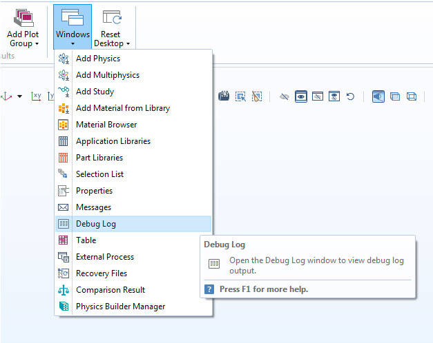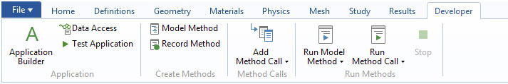 The Developer ribbon tab with the new Method Calls functionality.In addition to method calls, there are a number of improvements to model methods. A new built-in selectNode method lets you select which nodes in the Model Builder tree that should be selected and visible in the Graphics window, for example, after running a model method. You can also control the progress bar using the setProgress, setProgressInterval, and resetProgress methods, previously only available for application methods. To assist with debugging, the Debug Log window can be displayed in the Model Builder desktop window in addition to the Application Builder.
