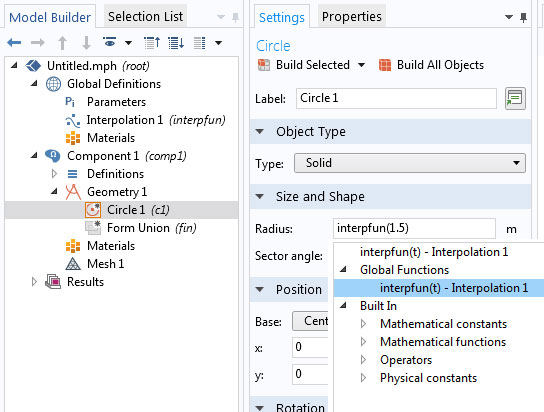 Any functions that you define under Global Definitions, in a geometry part, or under Results can be used when defining parameters, geometries, meshes, studies, and more. This functionality opens a wide range of possibilities for customizing a model, for example, to create complex geometries. You can define functions in a variety of ways: by an analytic expression, an interpolation table, an M-file in MATLAB®, or a material. These functions can then be called on from edit fields when defining the geometry, mesh, and study. In the edit field, pressing the Ctrl+space keys brings up a menu where you can choose a function or parameter to insert into the expression.