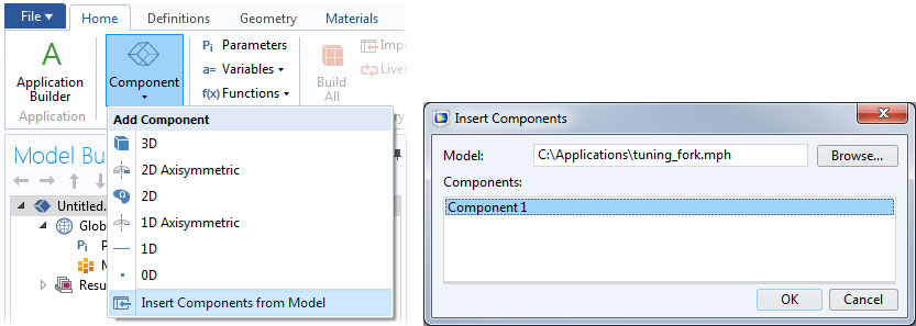 The Component list now contains the Insert Component from Model tool, which opens the Insert Component dialog box where the user browses for a model and then selects the components from that model to insert into the current COMSOL Multiphysics® section.