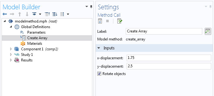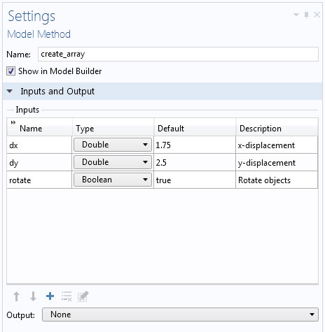 Model methods, introduced with COMSOL Multiphysics® version 5.3, enable you to perform complex operations directly on the model you are working with, such as setting up geometry sequences from data in a text file, changing solver settings based on specific criteria, or creating template plot groups. When creating and running methods, you may have certain inputs that you would like to specify before running your method. The new Method Call node, a subnode of the Global Definitions node, enables you to supply inputs to your model methods. You can even create multiple Method Call nodes using the same model method, in order to enter different default inputs for each node. The method inputs are displayed in the method call node's Settings window, automatically using the most appropriate form object type for the associated input type. Since model methods require the Application Builder, they can only be created or edited in the Windows® operating system, but method calls can be run and added for existing model methods on any platform.