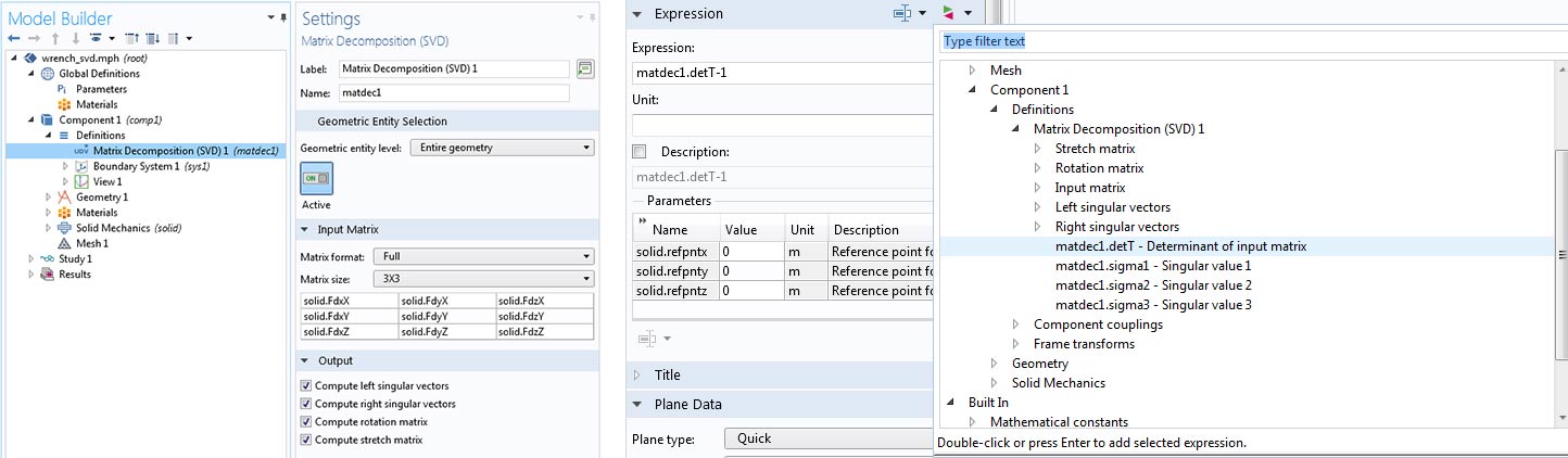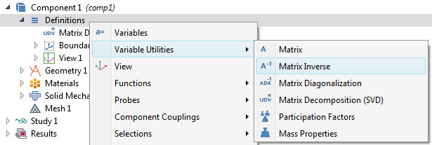 In a component, you can now define matrices and variables related to the matrix operations inverse, diagonalization, and singular value decomposition (SVD). The resulting matrices, as well as the input matrices, become available for use in equations and results in the form of scalar variables with a common base name and an indexing convention for the matrix elements. Square matrices of a size up to 9-by-9 are handled where each element can be a field variable such as a solution or solution gradient component, a coordinate expression, etc.