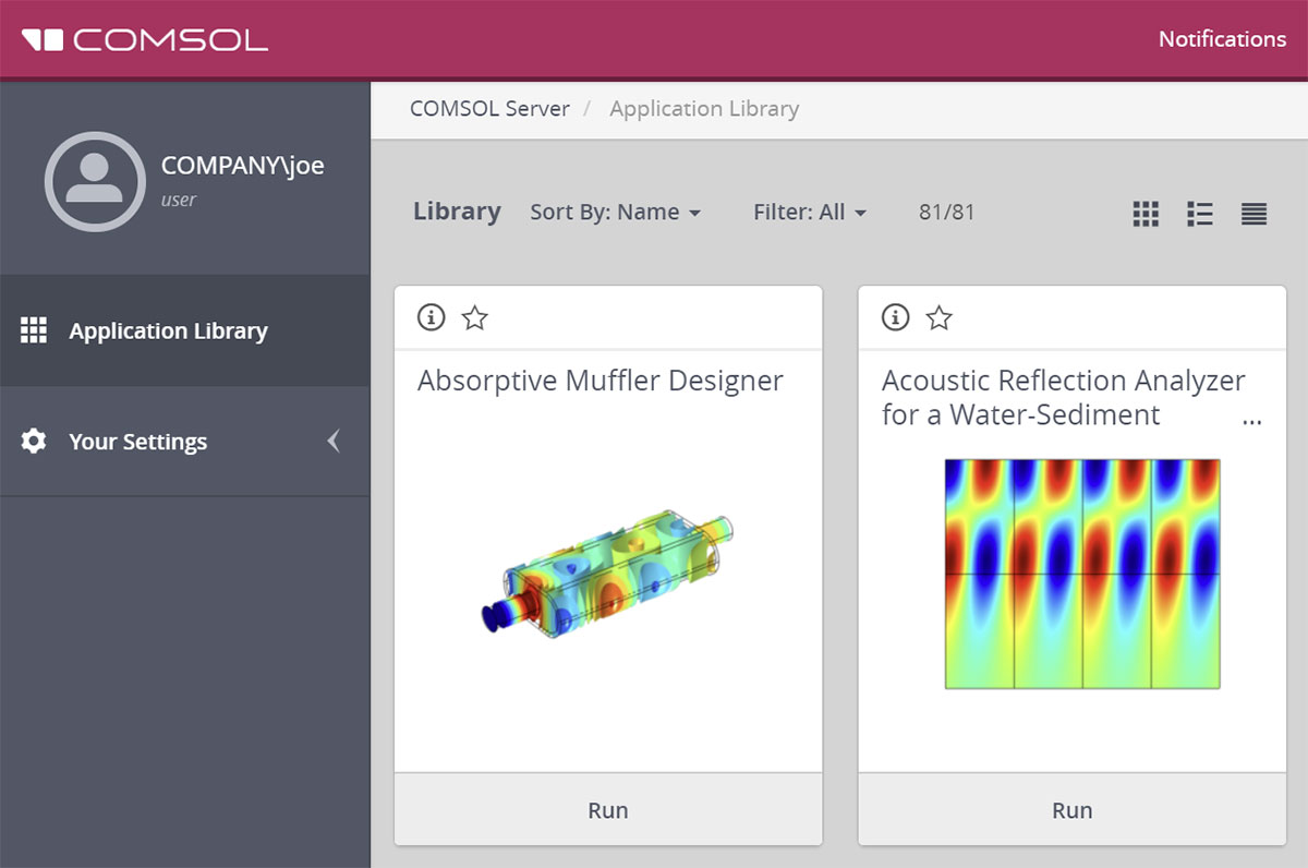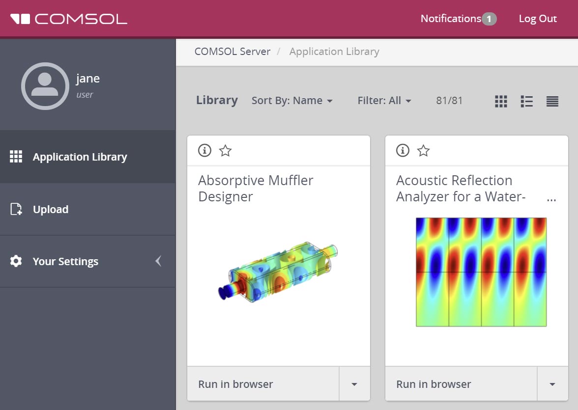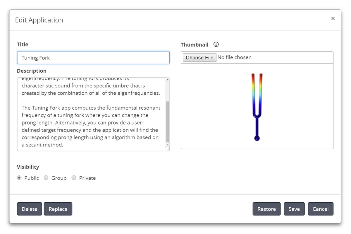 You can now change the title, description, and thumbnail of an application directly from the Application Library in COMSOL Server™. Additionally, you can replace the application with a new MPH-file via the Replace button in the Edit Application window.