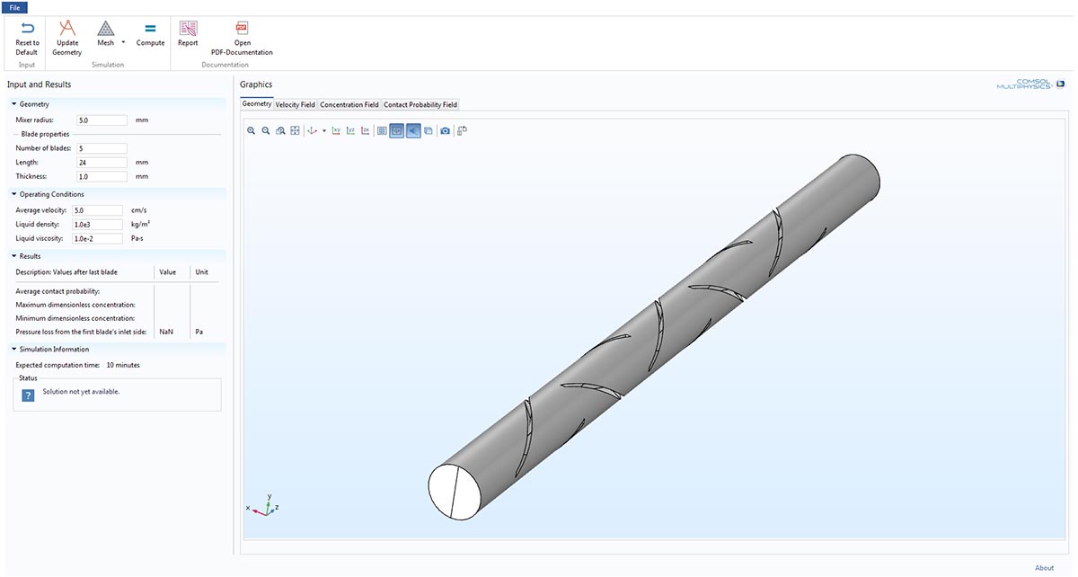 The Helical Static Mixer app with improved toolbar buttons in COMSOL Multiphysics 5.3a. The Helical Static Mixer app running in a browser in COMSOL Server™ version 5.3a with improved toolbar buttons. The Helical Static Mixer app running in a browser in COMSOL Server™ version 5.3a with improved toolbar buttons.