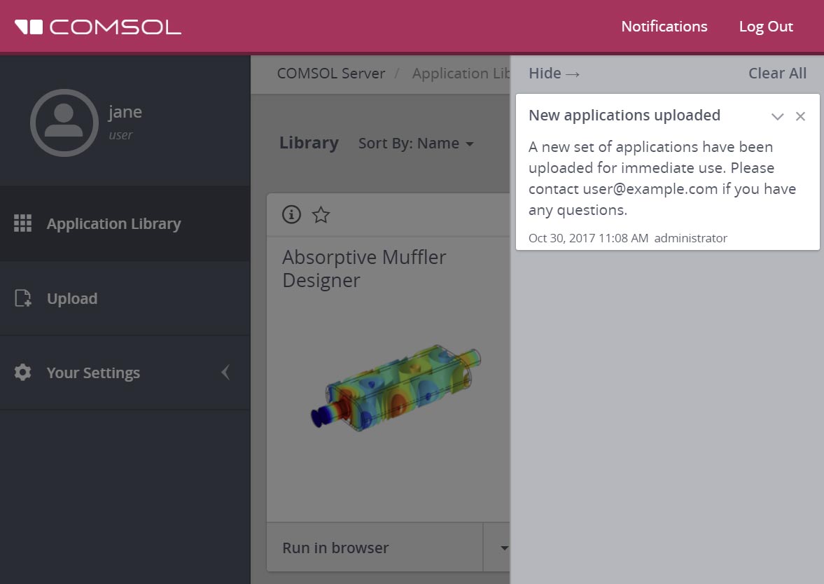 What notifications look like in COMSOL Server version 5.3a.