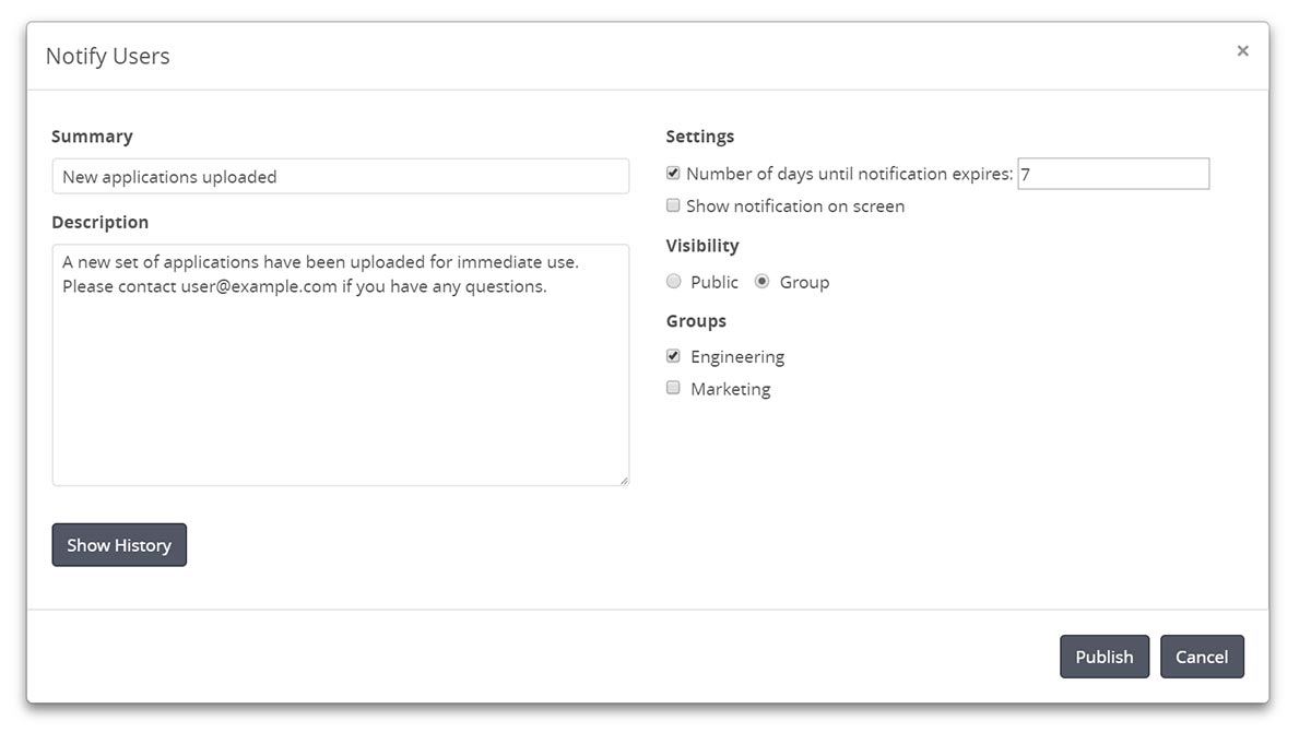 Administrators and power users can now send notifications. This feature can be used, for instance, to let users know about new uploaded apps, scheduled maintenance, or that an admin plans to shut down their app. Notifications can be configured to expire in a certain number of days, and you can choose to have notifications appear immediately or only after the user clicks the Notification link in the top navigation bar. Notifications can be sent to all users, a single user, or any combination of groups.