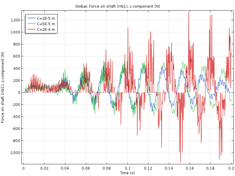 Bearing clearances should be kept at a minimum to avoid nonsynchronous vibration of a rotor. However, a tight clearance reduces the durability of the bearing. This tutorial model compares the vibration induced by nonlinear contact for different radial clearances.