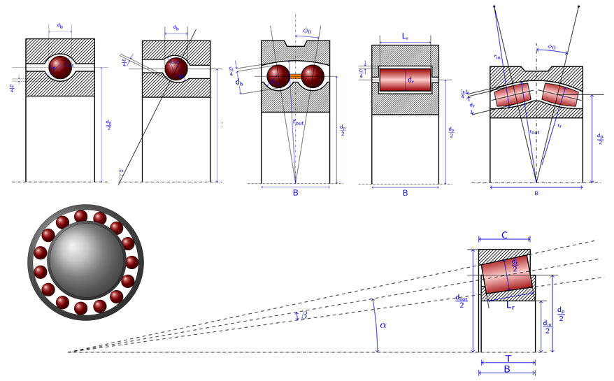Sketches of the six different bearing types and their geometrical parameters. The front view (bottom left) illustrates how only a certain number of the rolling elements carry load.