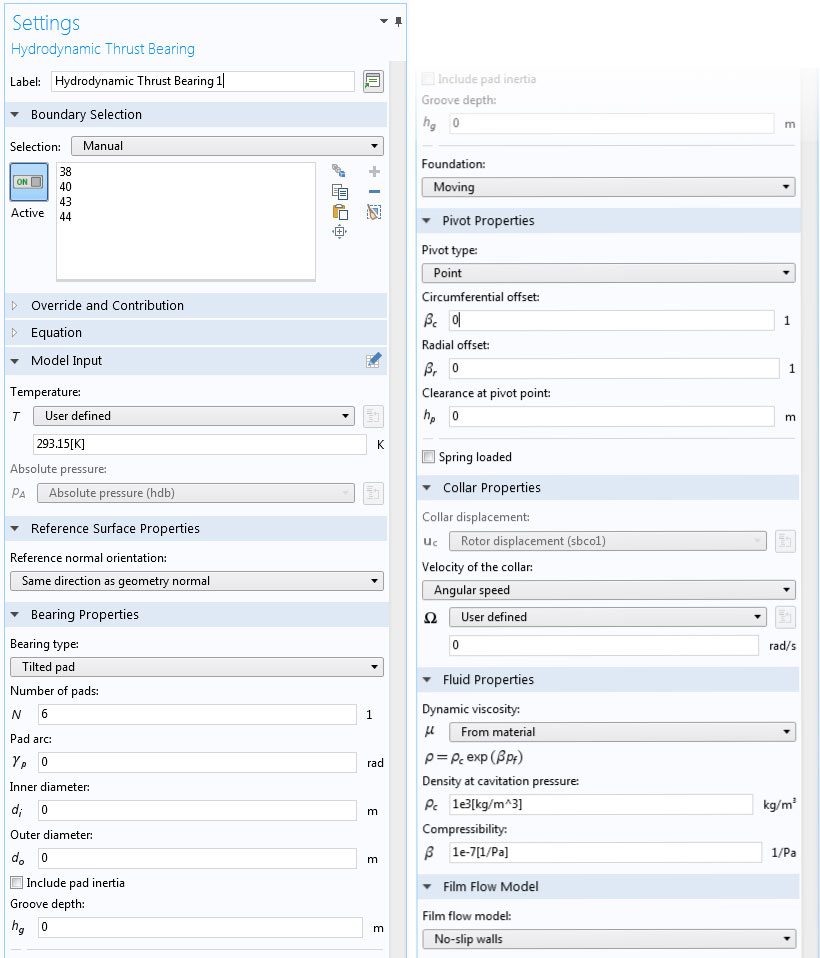 The Hydrodynamic Bearing interface can now also solve for a Hydrodynamic Thrust Bearing, a new feature included in the release of COMSOL Multiphysics® version 5.3a. The bearing types can either be Tilted Pad, Tapered, or User Defined. The tilted pad bearing can have either a point pivot or a line pivot. Additionally, cavitation of the lubricant can be included in the formulation.