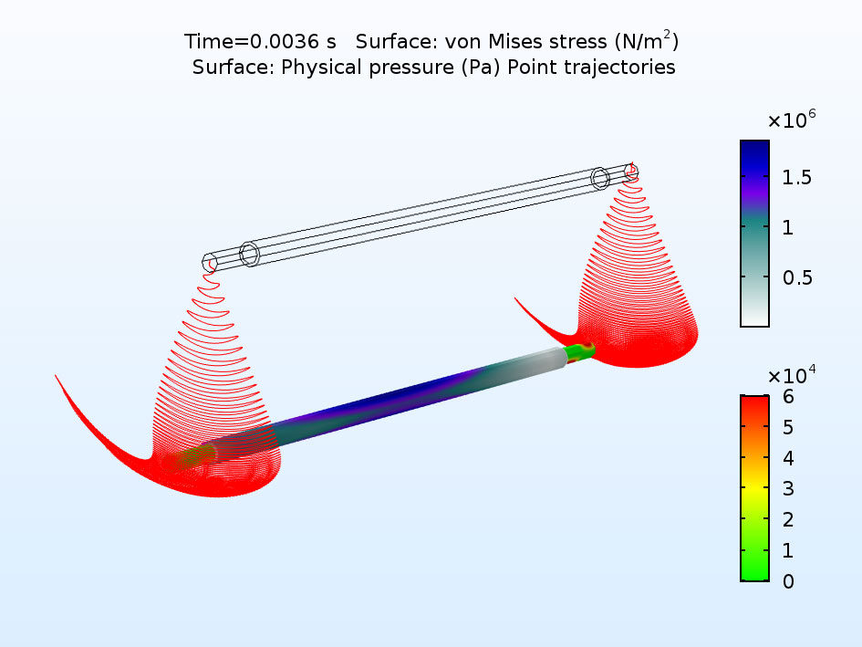 A flexible shaft, modeled with the Multibody Dynamics Module, rotating in a hydrodynamic journal bearing. The pressure distribution in the bearing depends strongly on the bending of the shaft.