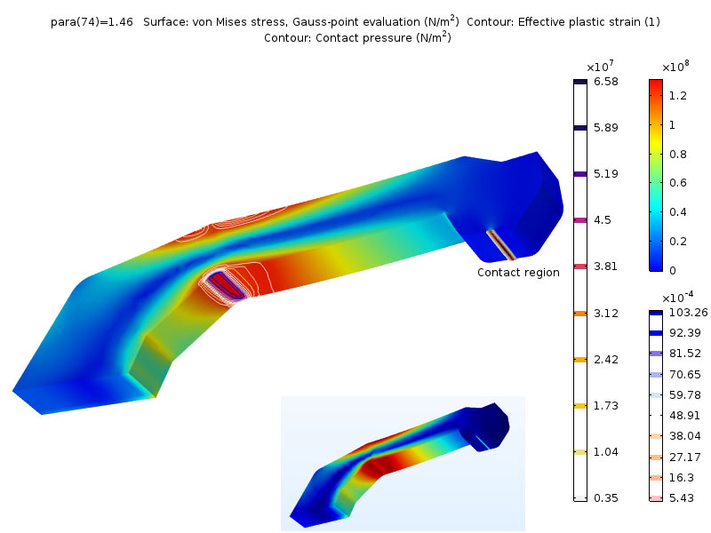 In this example, you can see brighter colors in the stress plot (RainbowLight color table), and plastic strain contours and contact pressure contours have been added by default. For comparison, a plot from the default plot in COMSOL Multiphysics® version 5.3 of the same model is shown.