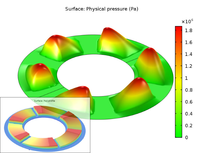 A thrust bearing modeled using COMSOL Multiphysics version 5.3a and the Rotordynamics Module.