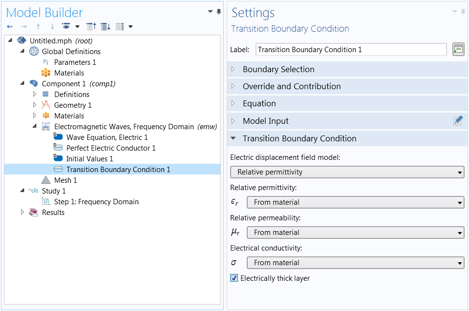 The new Electrically thick layer option decouples the two domains that are adjacent to a transition boundary condition. The boundary performs like an interior impedance boundary condition, but the layer geometry can be a surface rather than a domain.